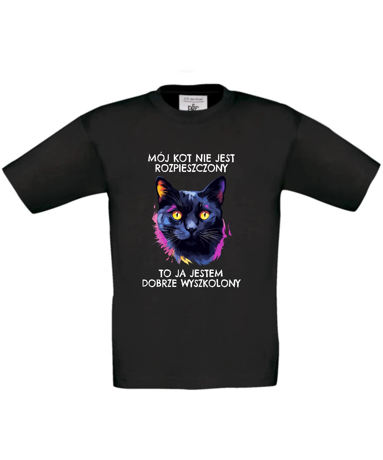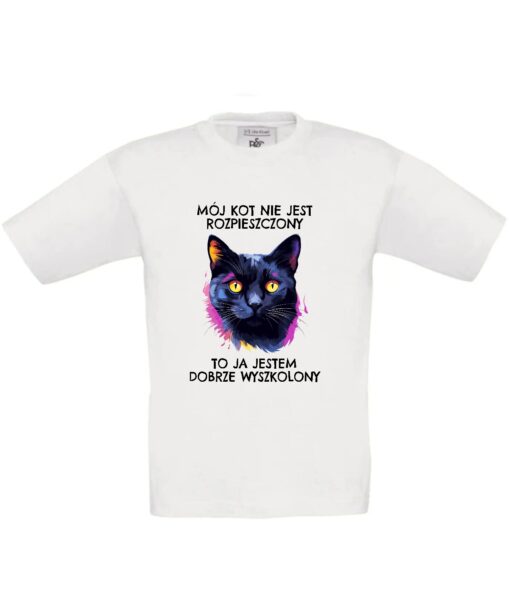 Prezentujemy wyjątkową dziecięcą koszulkę z kotem, która doskonale oddaje relacje między młodymi opiekunami a ich futrzanymi przyjaciółmi. Ta koszulka z kreatywnym napisem „Mój kot nie jest rozpieszczony, ja jestem dobrze wyszkolony” i uroczym obrazkiem kota, z pewnością stanie się ulubionym elementem garderoby każdego małego miłośnika kotów.