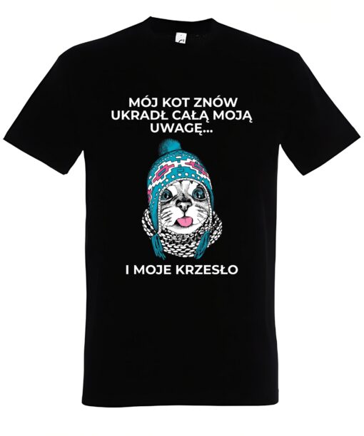Nasza klasyczna koszulka z kotem została zaprojektowana z myślą o komforcie i stylu. Na przodzie koszulki znajduje się obrazek kota w uroczej, wiazanej czapce, co nadaje jej niepowtarzalnego charakteru. Dodatkowo, napis „Mój kot znów ukradł całą moją uwagę… i moje krzesło” z pewnością przyciągnie uwagę i wywoła uśmiech na twarzy każdego, kto go przeczyta.